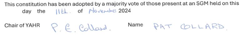 10.4 Money must be held in the YAHR bank account and withdrawals must be approved by 2 trustees. All cheques must be signed by 2 trustees.